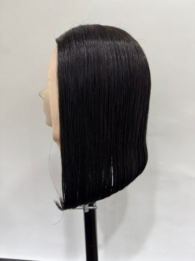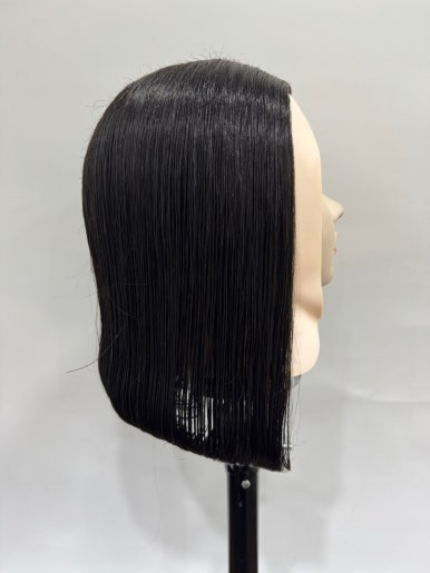 귀 아래쪽에서부터 부드럽게 연결되어 끝이 둥글게 떨어지는 a라인 실루엣 입니다.